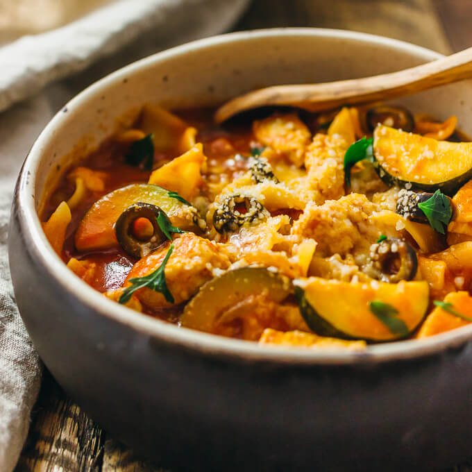 This dish is inspired by a “Chicken stew neapolitan” recipe found in a RAGU cookbook in the 1970s — a hearty baked casserole with layers of chicken, zucchini, and sauce topped with parmesan cheese. My chicken pasta recipe includes several of the same ingredients, but with a modern twist as a one-pot pasta dish. It’s also a simpler recipe since it doesn’t require transferring anything to the oven, and uses everyday ingredients that are easy to find. For the sauce, I used a RAGU traditional pasta sauce, which is fitting for this recipe and adds a lot of rich flavor to the pasta.